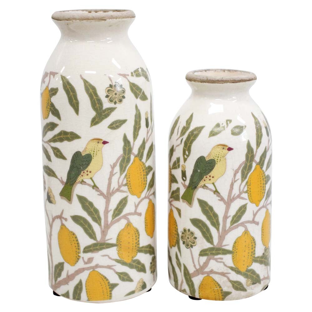 Something about a vintage lemon print on creamy ceramic really brings out the charm in any space - and our set of two bud vases delivers just that. The larger one sits at 20cm high, while the smaller's a handy 15.5cm, both with a classic shape and those lively yellow lemons, leafy greens, and sweet bird details. They're ideal for brightening up a windowsill or shelf and we think these will be an easy sell to customers looking for that cheerful pop of colour.