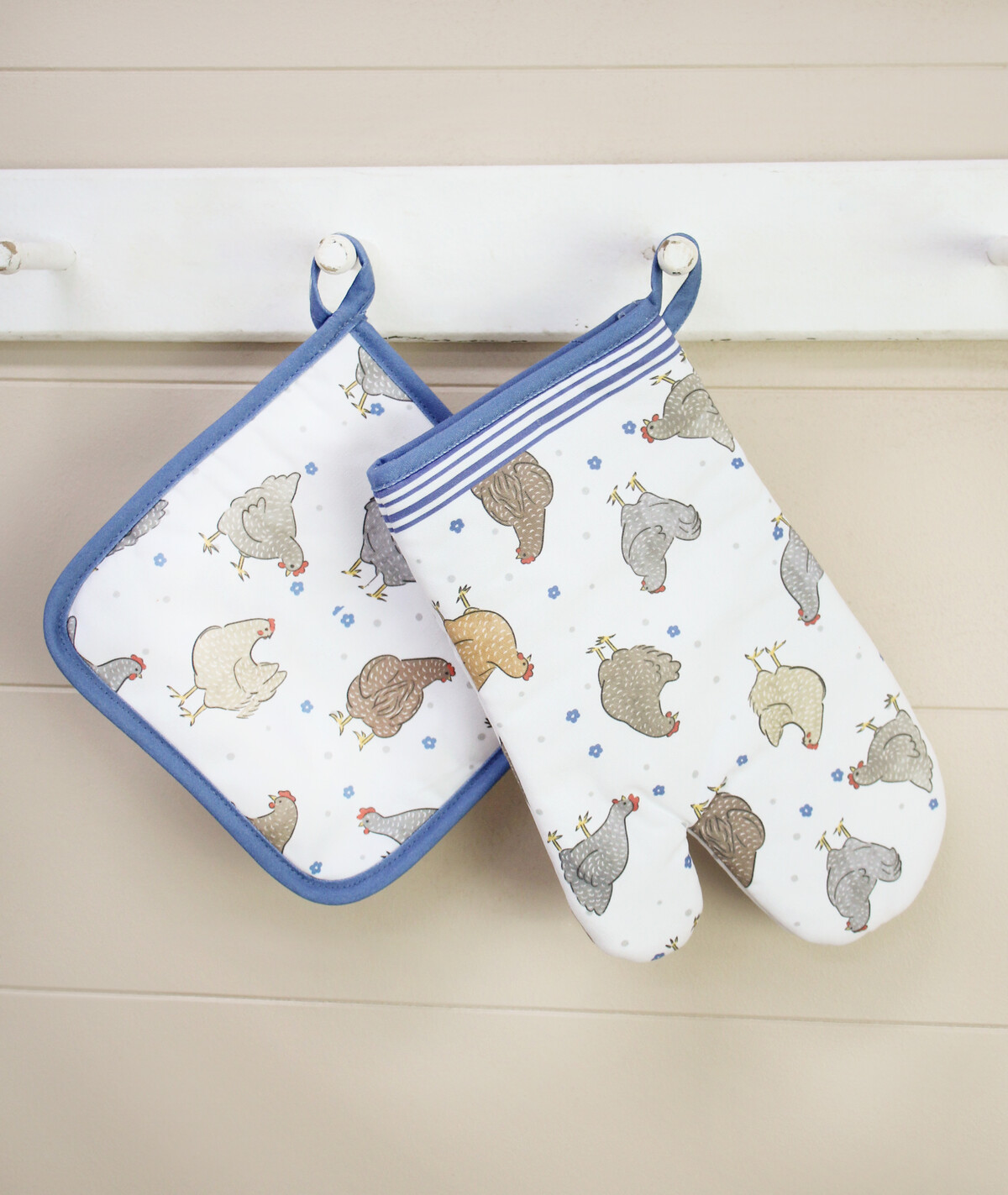 The oven mitt measures 18x30cm, the pot holder is 21x21cm and the tea towel is a generous 50x70cm. The mitt and pot holder are made using cotton outers and a polyester inner for heat resistance, while the tea towel is all-cotton. All three come with blue piping for a high-quality finish.