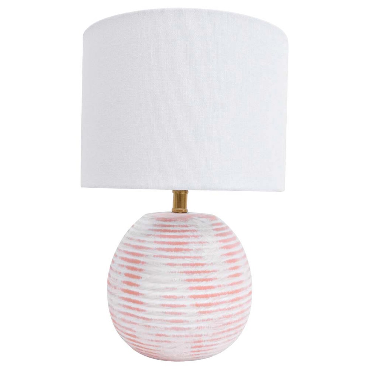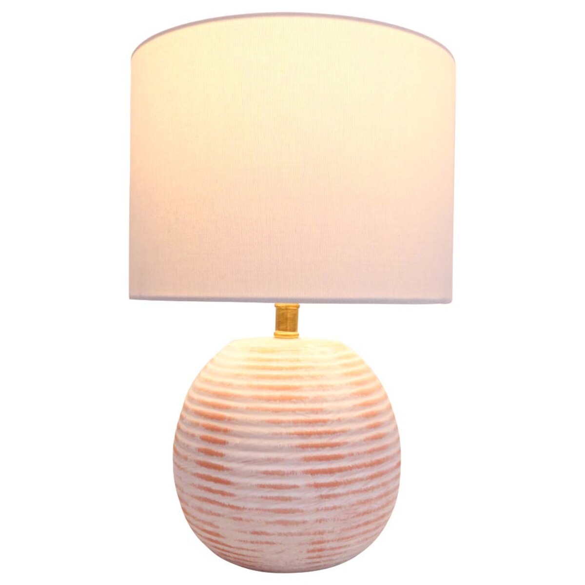 The Lamp Urban is really a quiet kind of beauty - we think that’s why it ends up being such a crowd-pleaser. It has a round ribbed base, and we’ve done this one in a hand-finished ceramic for the subtle luxury of natural imperfections. Now, it is primarily white, but there are those peach horizontal stripes that bring out the beautiful ribbing along the lamp’s surface.