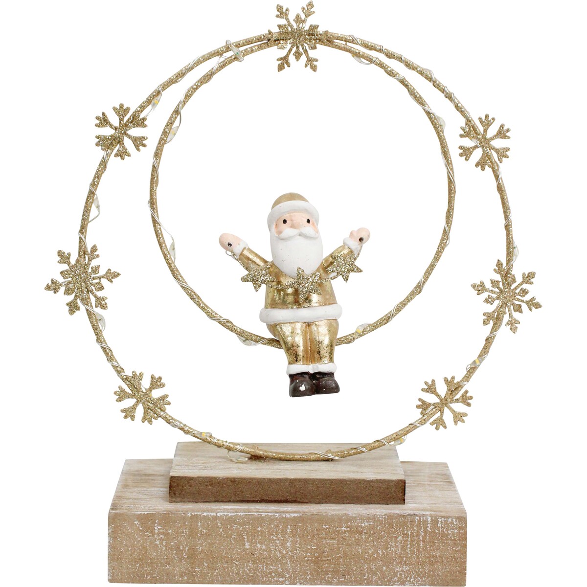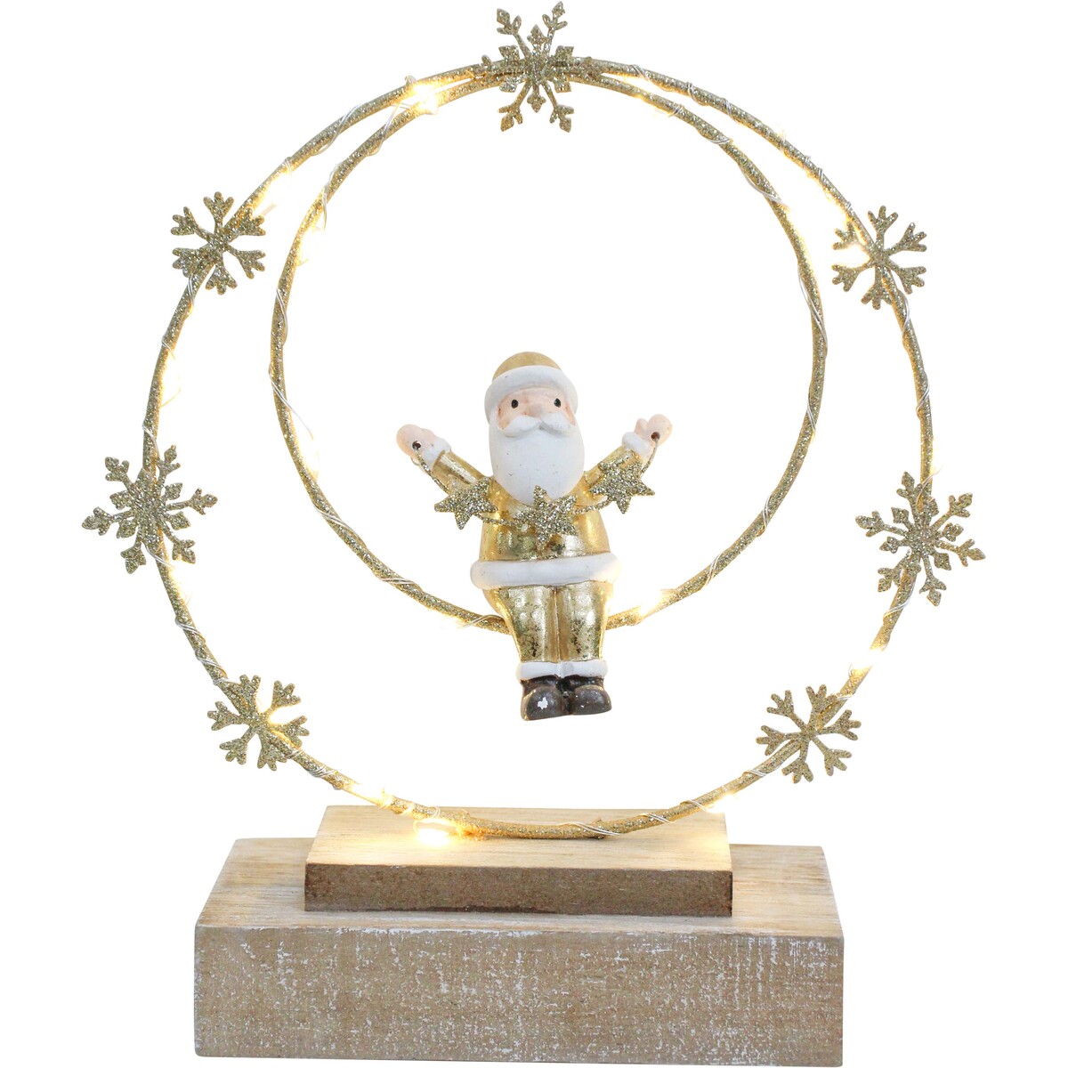 The golden tones make this a great pick for both modern spaces and more traditional homes, too. It’s got warm white LED lights around the double ring that look absolutely stunning when the lights go down. We like how it feels whimsical with its shiny Santa but not childish - customers can put it out on their dining table, mantelpiece, or even at work without worrying about it clashing with existing decor. It does need 2 x AAA batteries (not included), but that's part of why it's so easy to display anywhere - no cords to hide or faff about with.