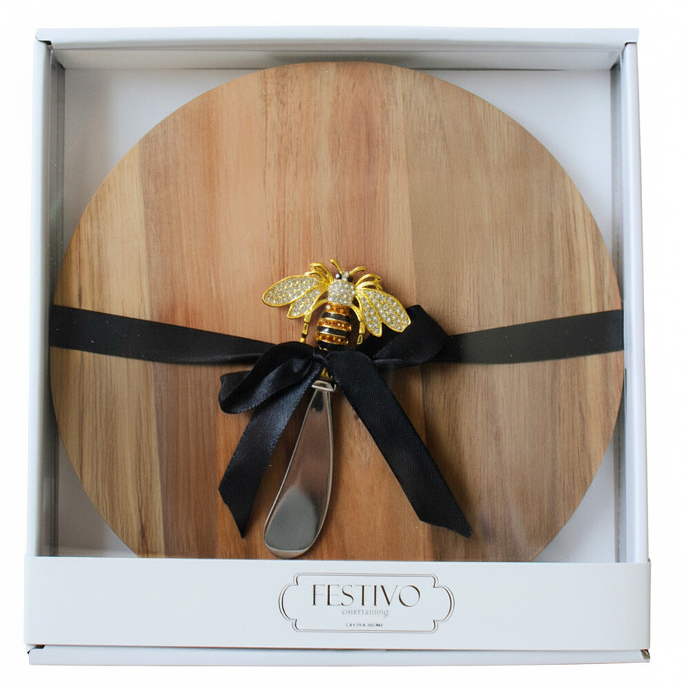 Serving Board/Spreader Bee Wholesale A lot of serving boards - especially in the round shape - tend to be quite similar, so we wanted something a bit more fun and charming. We recently added our Serving Board/Spreader Bee to the range and we’re quite happy with it because it really brings some life to tablescapes, especially for parties. The gold metal bee motif on the handle is elegant yet whimsical and those little rhinestones just catch the light enough without looking garish. These are compact enough at 22.5x22.5x3.5cm that customers will use them for almost every party or cheese and wine night. The wooden surface is perfect for cheeses, crackers, fruit, bread… whatever the spread calls for. And although these aren’t meant for the dishwasher - it’ll destroy that metal finish anyway - you only need a soft cloth and warm water to clean up after using them anyway. The bee iconography works beautifully as a spring/summer table accessory but doesn’t look out of place any other time of year either. Plus all gifting value aside (and there’s lots), these are just simple but beautiful serving boards that are very versatile. Our advice: get enough stock because these tend to move pretty fast in stores!