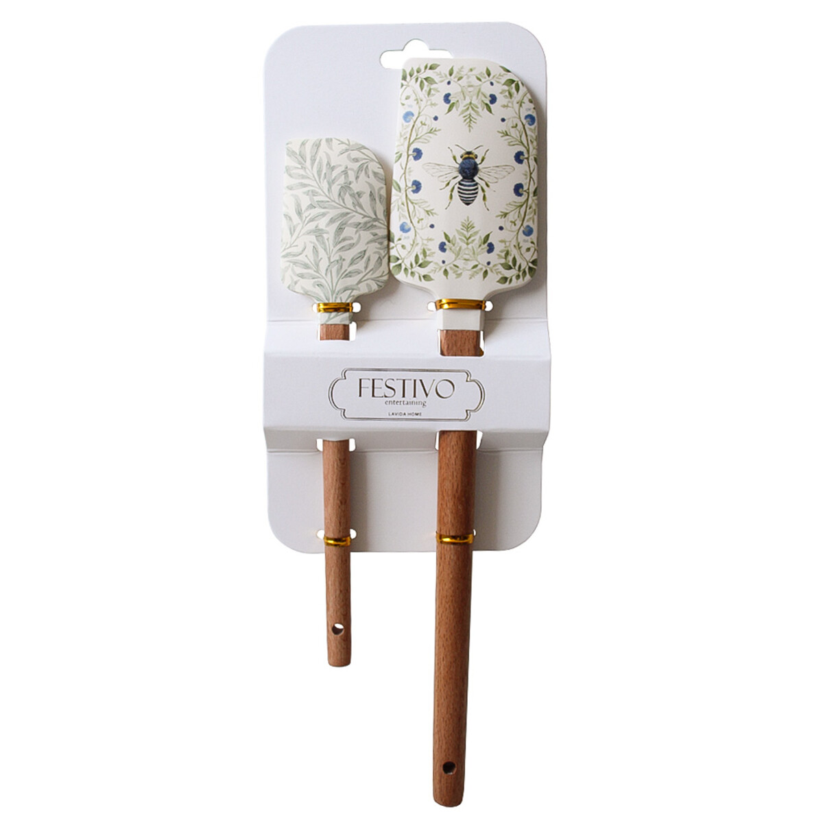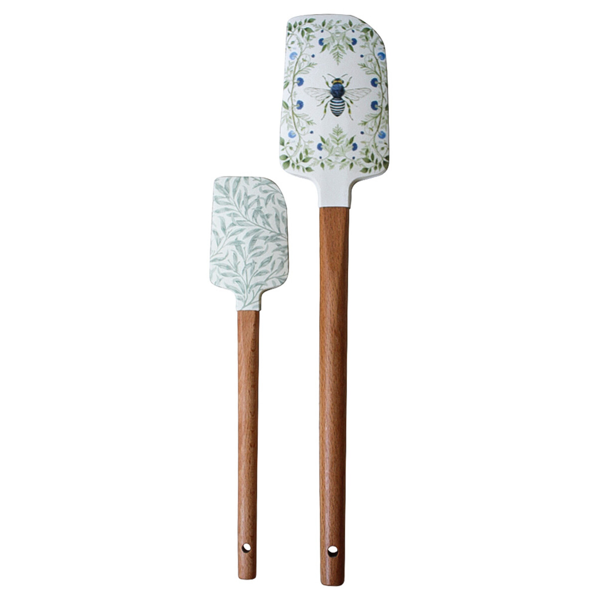 The design here is very cutesy farmhouse with the bee illustration, green leafy border and white and blue florals. The smaller spatula has a lovely pop of green leaves over a solid white background, so it still matches but gives you some variety (sometimes two patterned items can feel visually cluttered). Handwash only for these since silicone and wood do tend to chip in the dishwasher.