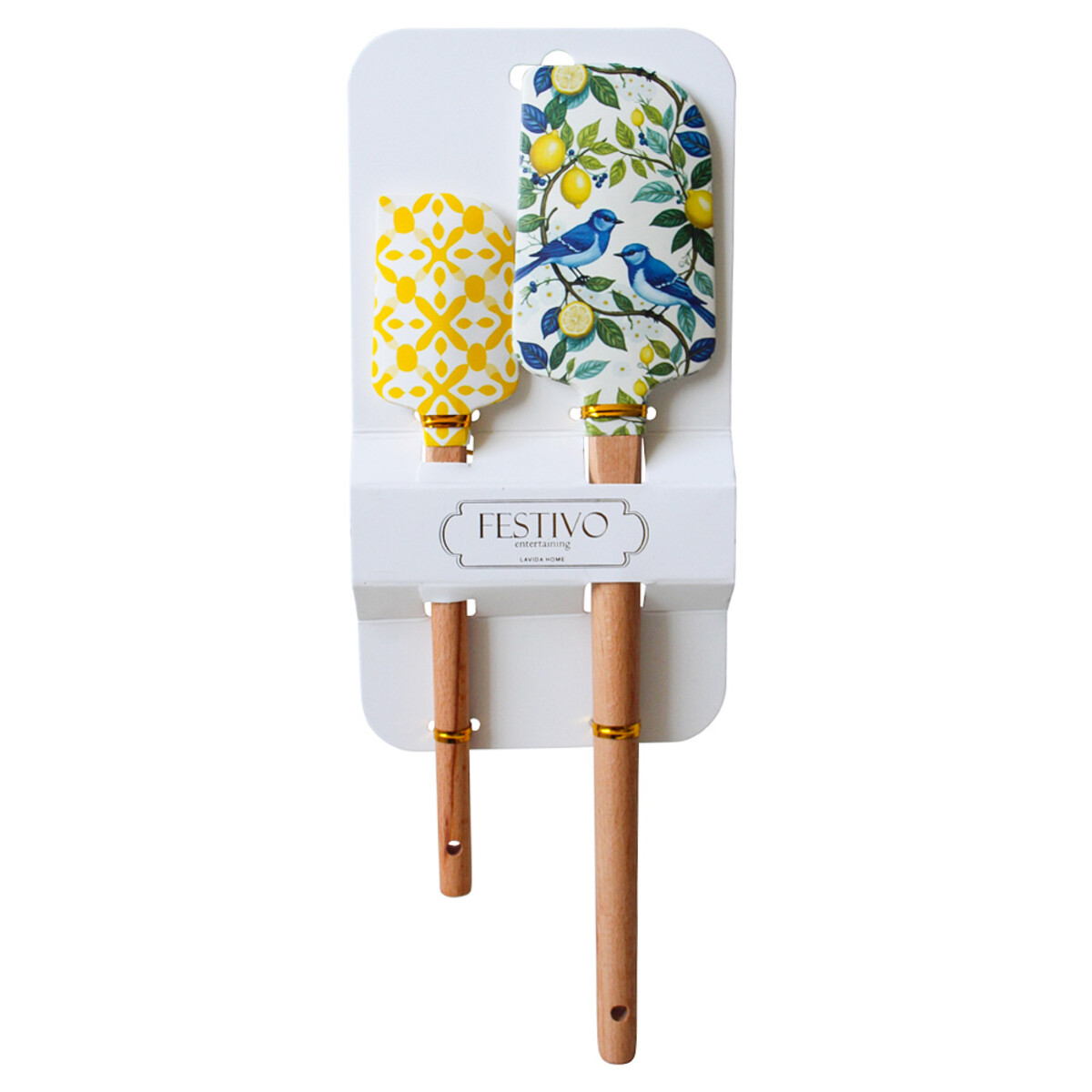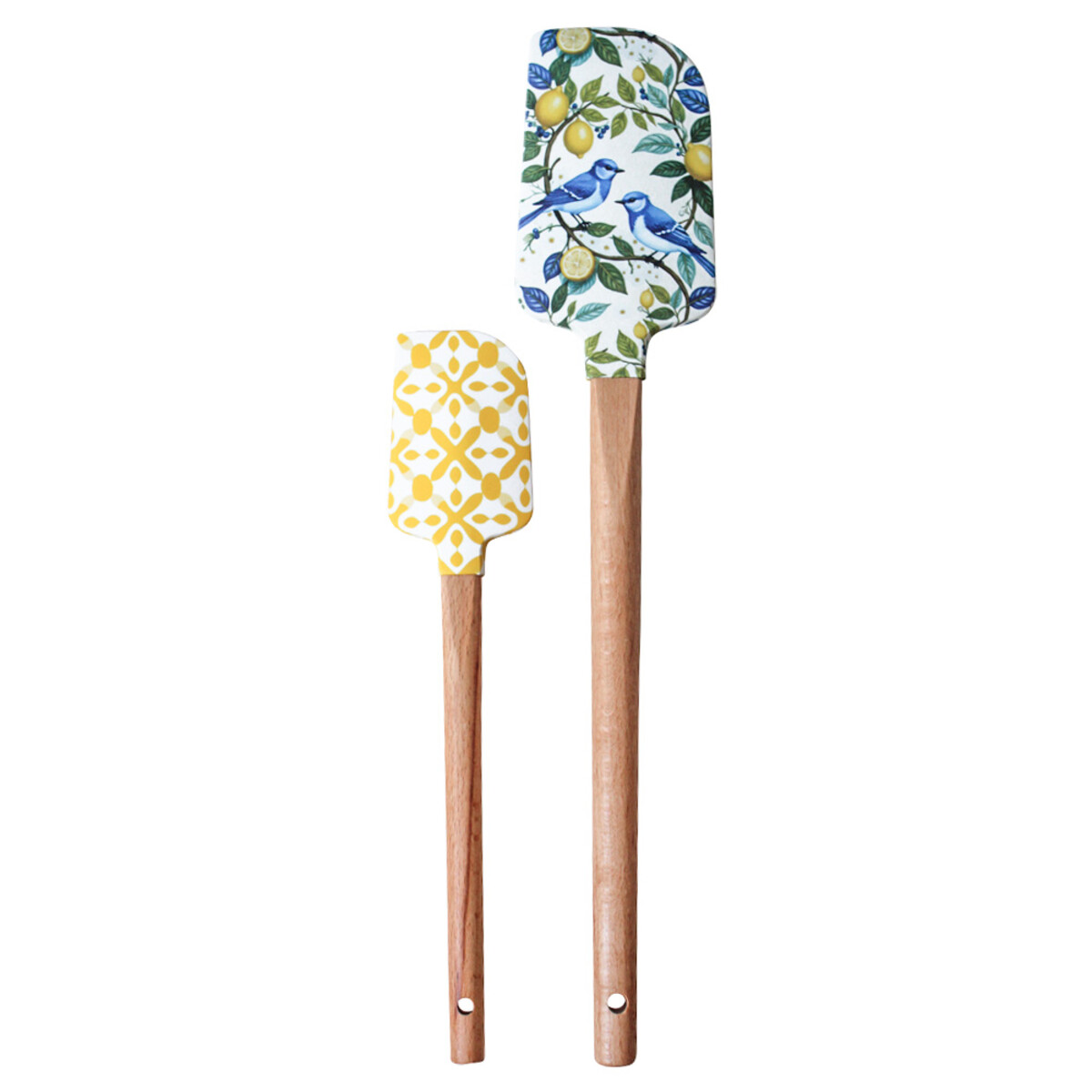 Spatula Set Lemon Bird Wholesale Usually, spatulas are... well, spatulas. It’s hard to get much personality going with just silicone and wood, but then you come across a set like the Spatula Set Lemon Bird and suddenly there’s so much more to go on than “where’s the flat one?” These stand out in the kitchen drawer and actually have an effect on kitchen mood - we didn’t realise how fun that could be until we started mixing up designs. This pair features blue birds on a lemon branch for the first (and larger) spatula, while the smaller one features these really distinctive yellow diamond shapes against a white background - very retro. The natural finish wooden handle is polished with two gold rings at the top for that extra contrast between natural and manmade materials, which sounds like overkill but looks really good together. Remember: no dishwashers, please - keep them handwashed for long lasting colour. And at 34x12x2cm they’re excellent fits for small-to-mid kitchen drawers.