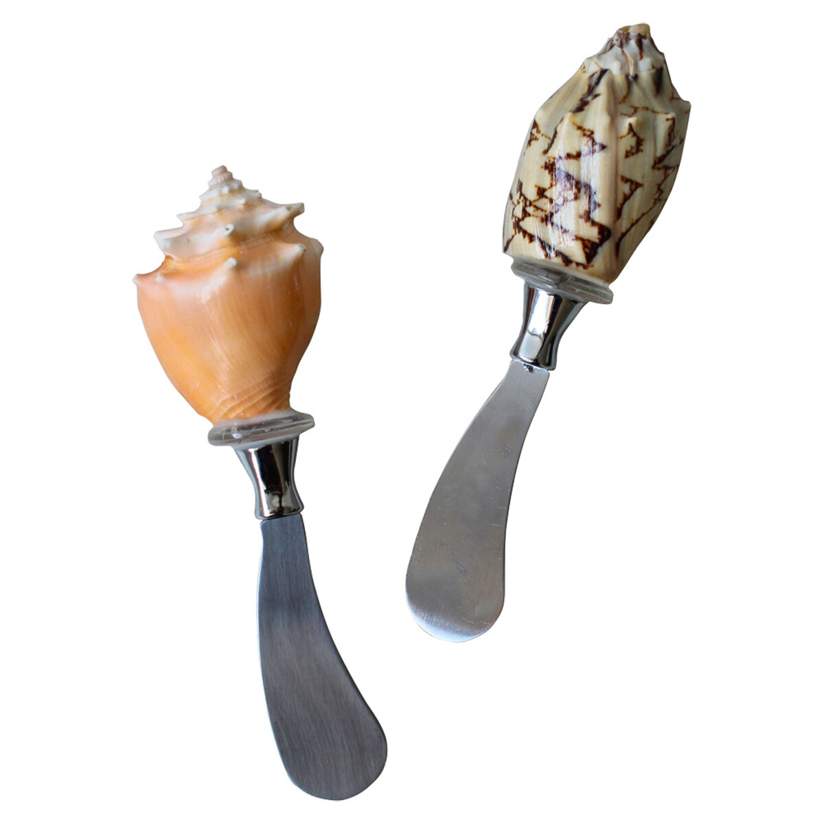 Hand-crafted, never mass produced. Our Spreader S/2 Shell set is the kind of product we want to pull out for special occasions. The brushed stainless steel blades have this really nice matte finish to them and the gentle curve just feels right when you’re cutting or scooping through cheese and preserves - but these spreaders are all about those handles. Each is totally unique because we use real seashells and they’re not the generic ones you see everywhere either; one has a warm peach tone, the other is cream with zigzags in brown.