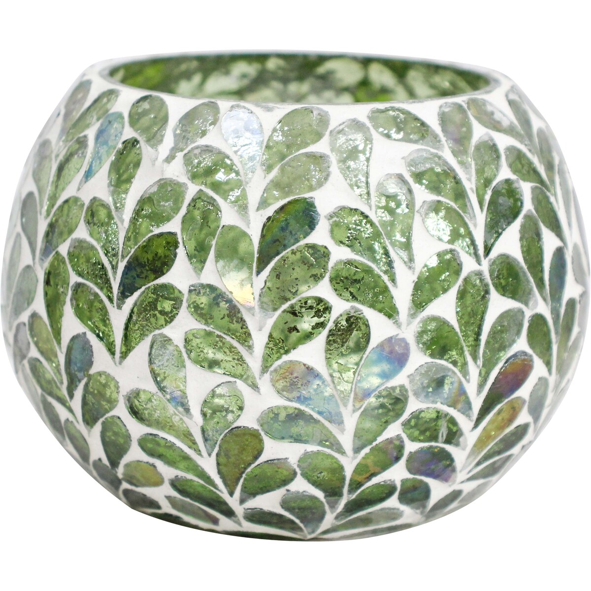Made from fine quality glass which is resistant to heat-the mosaic pattern in green is speckled adding more character to its look. Will help you define your spaces with the usage of tea lights. A mere 9.5 cm in height, it resembles a little round globe with an opening on top and curves generously to create this gorgeous rounded shape. The votive can hold a small candle-a tea light and the minute you light it, the details of its mosaic pattern comes alive. A brilliant way of adorning your spaces and adding more depth and dimension helping include every small little space into the décor more homogenously.