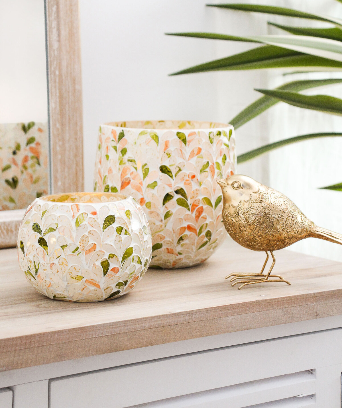 The mosaic glass made votive is a play of colours and will bring the same stunning beauty in to your spaces. The colour palette is mostly pastels in whites, peaches, greens and more off whites. The glass is sturdy and will take the heat of the candle well. Apart from brightening up the space, the mosaic pattern introduces a delicate texture though its design. The spring fresh colours liven up the space and with the tea light lit from within, the effect is even more delectable.